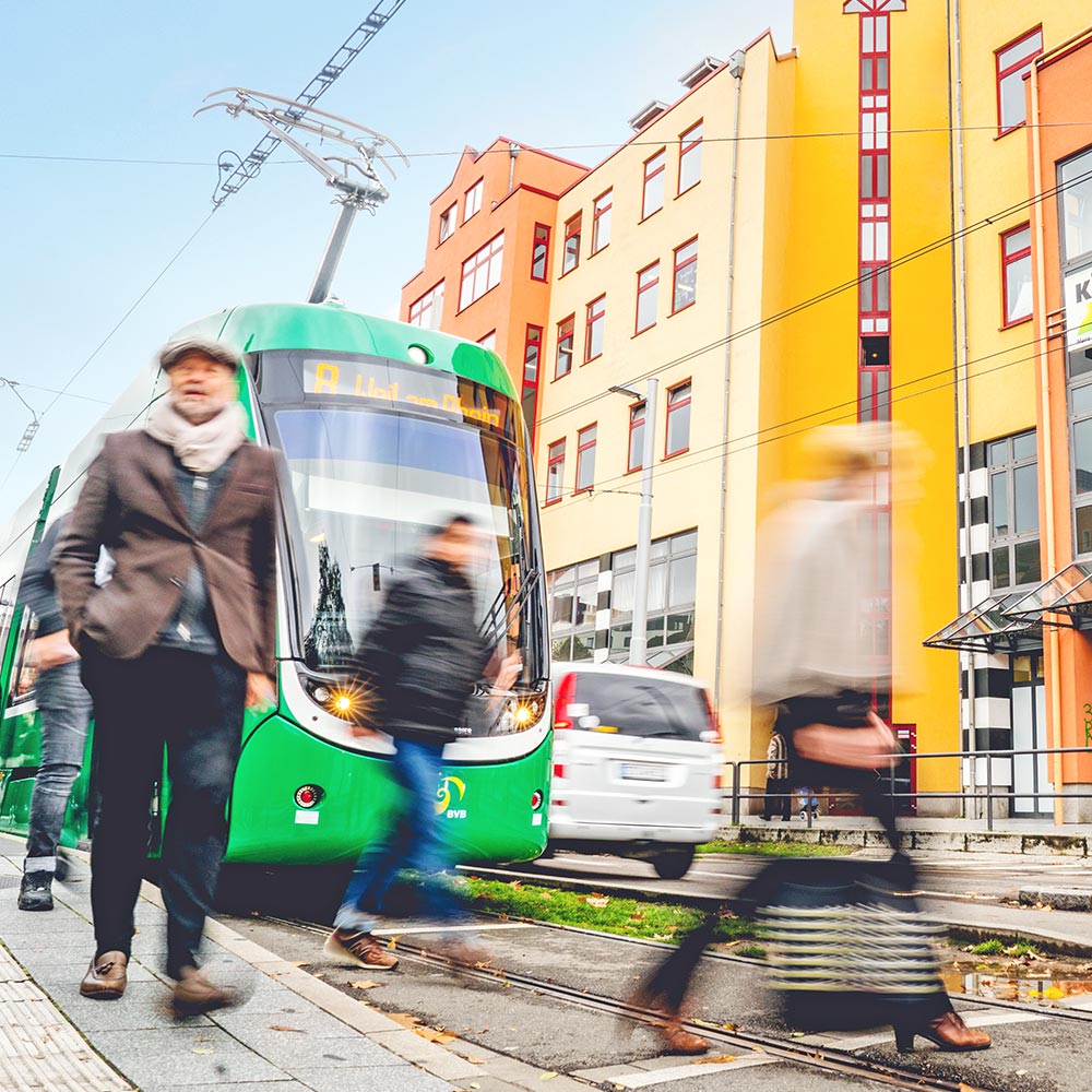 Tramlinie 8 in Richtung „Weil Bahnhof“, Haltestelle „Dreiländerbrücke“